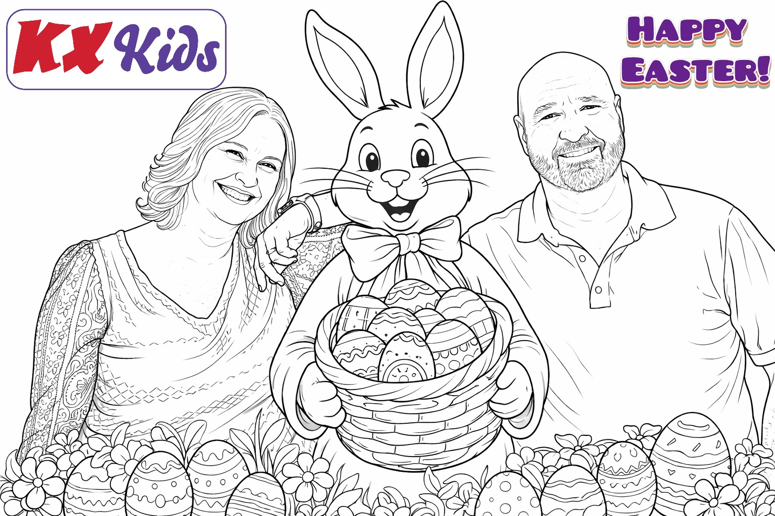 KX Kids Easter! Happy Easter, KX Kids! Have fun colouring this page with the Easter bunny and your favourite KX morning show, Ellis & Archer! (We bet you didn't even know they were friends!) Enjoy the holiday!
