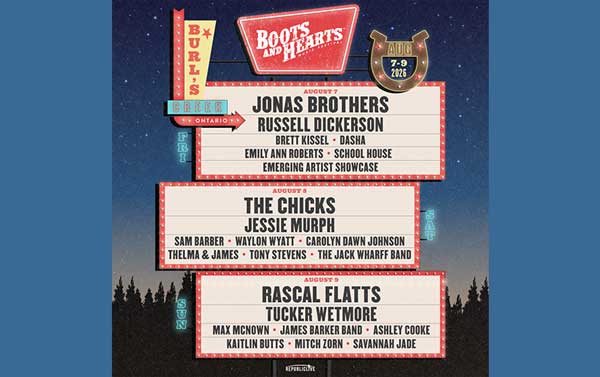 Boots and Hearts Music Festival Burl's Creek Event GroundsAugust 7-9th, 2026 Boots and Hearts Music Festival is back at Burl's Creek August 7th - 9th, 2026 with The Chicks, Rascal Flatts and more! Previous article: Owen Riegling – One Night Only Prev Next article: Monster Energy Outbreak Tour Presents: Vincent Mason There I Go Next